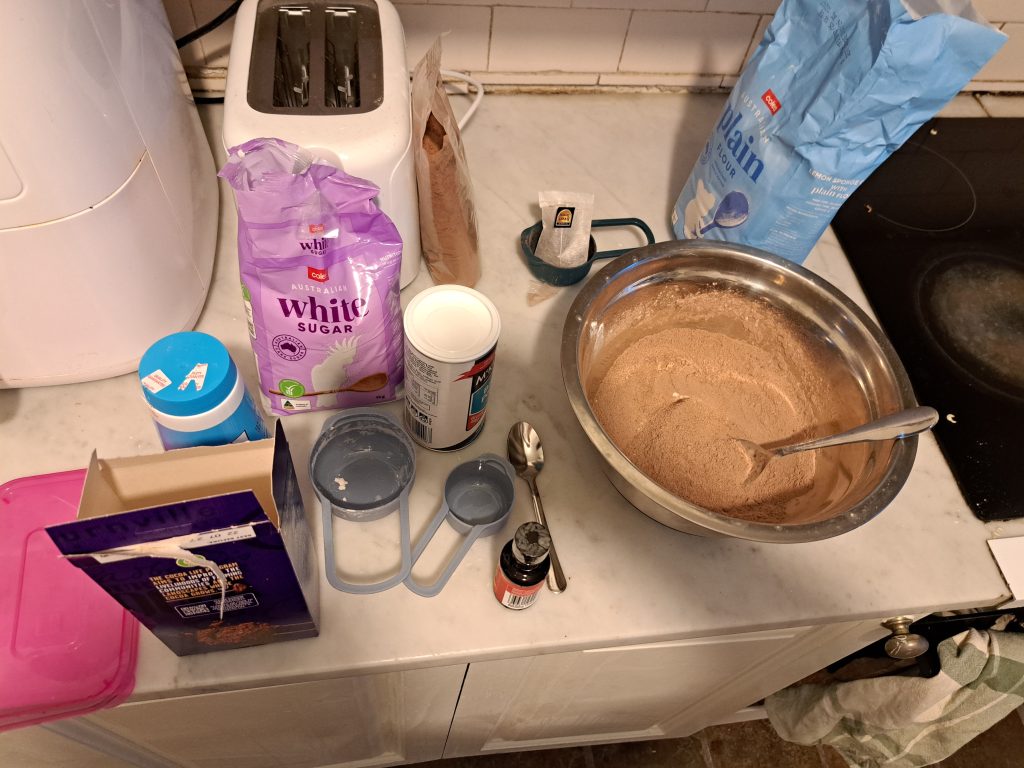 Het originele plan voor vandaag was op een wandeltrip van de Bushwalker Society gaan, maar ik had blijkbaar geen wekker gezet gisteren, dus dat mislukte. Maar dat betekende wel dat ik tijd had om een taart te bakken voor Sunny’s verjaardag! Cailene had in de groepsapp gevraagd wat iedereens favoriete smaken in eten waren en Sunny zei chocolade en koffie, dus we wilden eigenlijk na de wandeltrip een excuus vinden voor twee van ons om snel naar de supermarkt te gaan voor een taart. Maar omdat ik toch niet mee was naar de wandeltrip, was dat mijn middag: chocolade/koffie taartrecept uitvogelen, boodschappen en taart bakken (en heel erg hopen dat t een beetje lekker is).