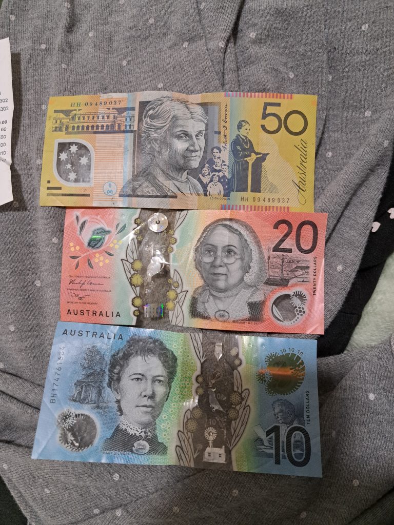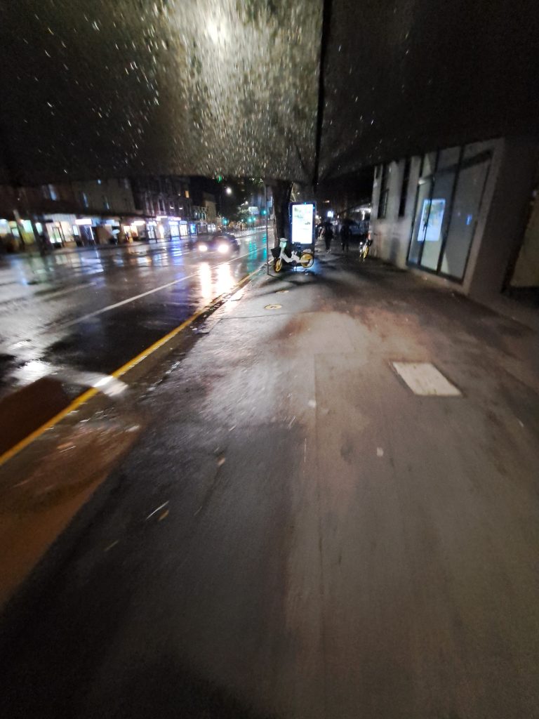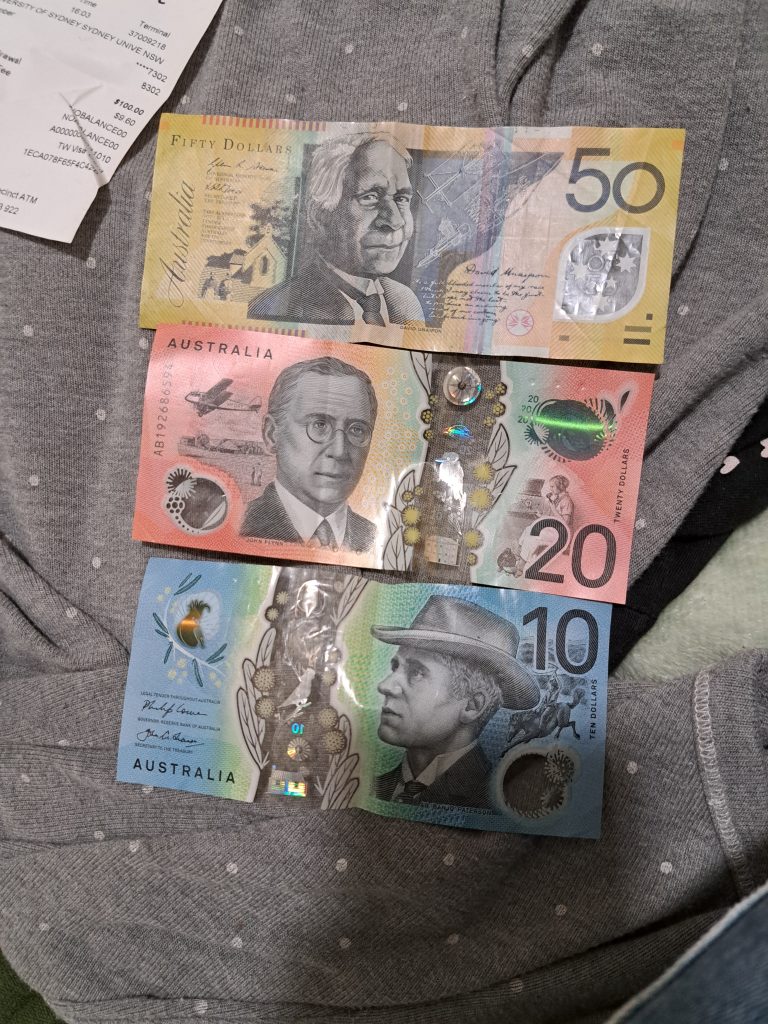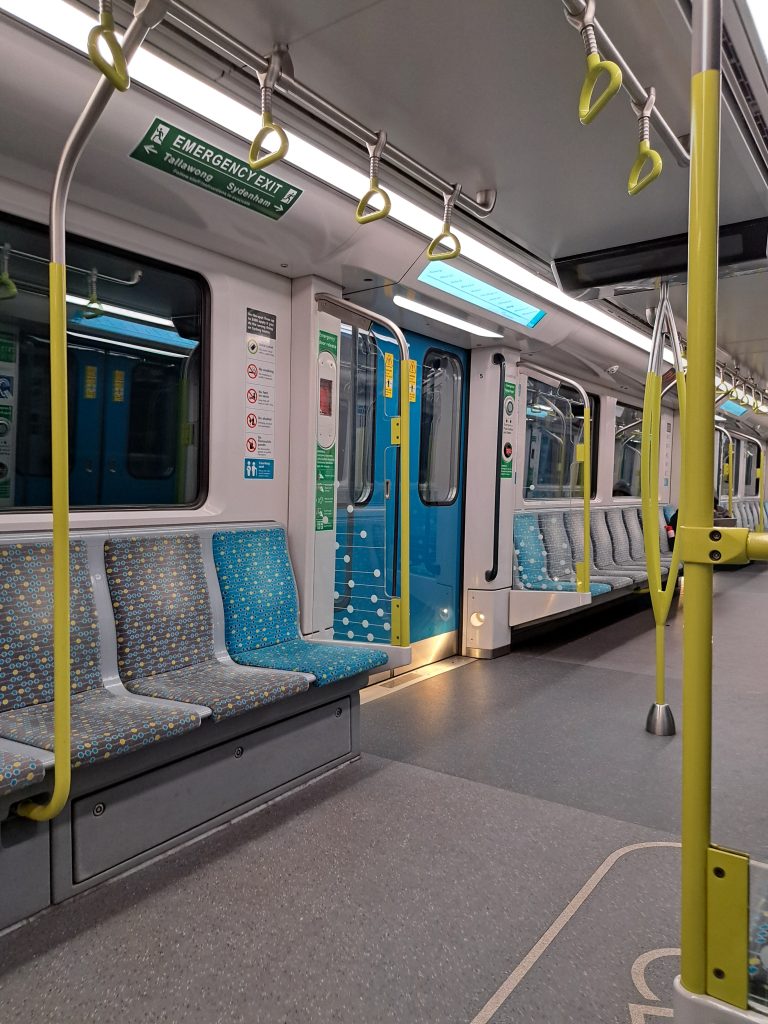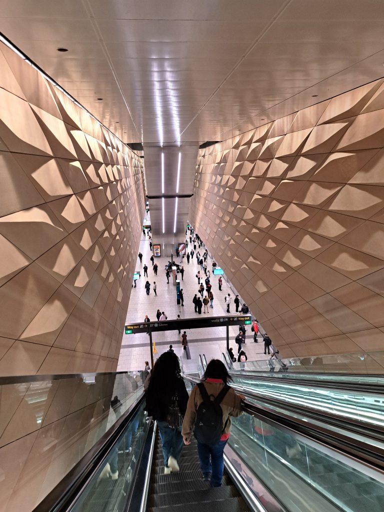 Daarna een ATM gezocht, bij wel drie locaties geweest waar een ATM zou moeten staan volgens een website, maar nee. Dus lekker verder in de stromende regen en uiteindelijk gelukkig een gevonden. Flink afgezet door dat ding, kostte me 9.60 dollar (dus gedeeld door twee plus een beetje is rond de 5 euro) puur voor het geld afnemen. Met mn natte sokken en schoenen naar huis gelopen, even een poging gedaan ze te drogen in tien minuten, maar dat was natuurlijk niet echt succesvol. Mijn andere paar schoenen was nog nat van gisteren… Dus weer fijn de regen in en naar de bus en daarna een uur met de metro naar Hills Showground (een heel stuk ten westen van mij), de metro was heel druk, spitstijd. Oh en de metro’s hebben hier zo’n coole deuren die precies aansluiten op waar de metro stil gaat staan.