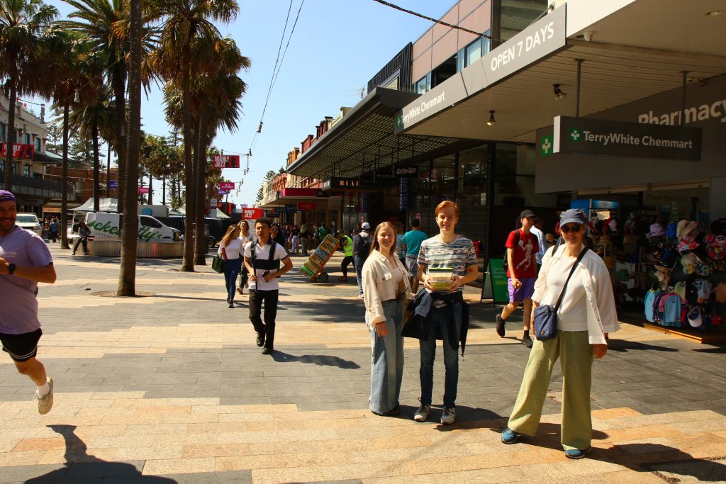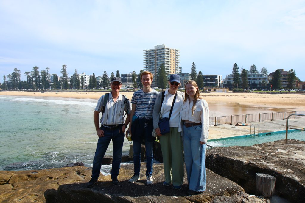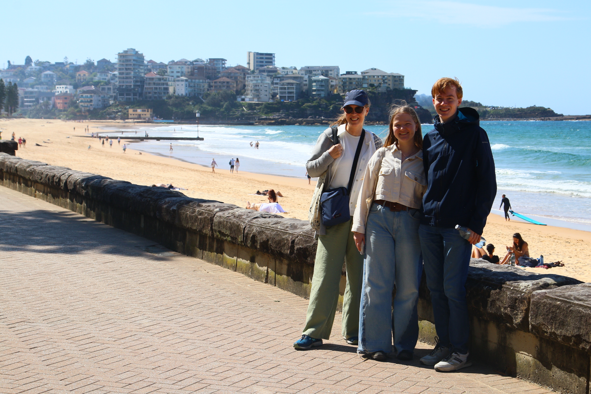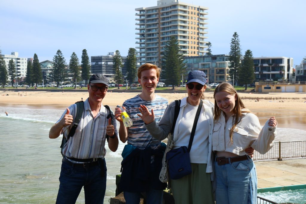 Om 10u ’s ochtends waren de poppetjes bij mij, met zn allen naar Circular Quay (uitspraak als t Engelse ‘key’) gebust. Mama is niet zo gewend aan bussen merkte ik haha. Met de ferry naar Manly gegaan. Die ferry vaart best een mooie route, tussen het opera house en de harbour bridge in, oftewel, papa ging los met foto’s maken (wel terecht hoor). Mama werd een beetje draaierig van de extra snelle ferry, dus die bleef maar even zitten. Eenmaal daar wat lunchspul gehaald bij de Coles en bij Manly Beach ergens een picknicktafeltje in de schaduw kunnen scoren. Het was nog best een beetje frisjes in de schaduw met wat wind. Verderop (1 km verder weg ofzo) was er een dikke rookwolk te zien, brand?? Na de lunch wilde ik weer verder lopen over het strand, maar ze moesten toen nog even tickets boeken voor wat activiteiten in hun reis, en dat kon blijkbaar niet op de boot… Duurde nogal lang. Maar oke, na een goed halfuur klooien met tickets mochten we toch weer verder lopen, hè hè. Nou, toen dus langs de zee gelopen en naar een mooi rotsplekje gegaan waar ik de vorige keer flinke golven omhoog had zien ketsen, maar uhh ja het water was nogal stil, dus pech. Stukje de hoek om gelopen waar een soort tunneltje door de rotsen was en daarachter was het ook heel mooi! Daarna weer teruggelopen langs de zee en yo-chi gehaald, nommmm. De rest vond het ook lekker, al had papa niet de echte ‘yo-chi experience’, want hij haalde gewoon een hoorntje. Onderweg zagen we wat Australische planten en dieren zoals banksia’s en cockatoos. Ik vond het best grappig om hen er helemaal enthousiast over te zien, ik heb er inmiddels al zoveel gezien haha.