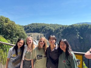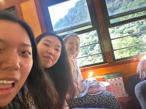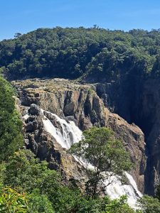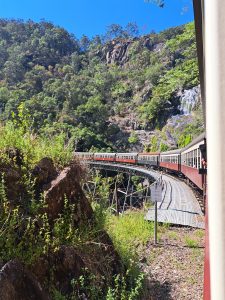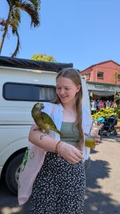Vroeeegg opgestaan (4:45u) want we moesten vroeg vertrekken om op tijd bij onze bestemming te komen. We zagen een heleboel vleermuizen! Na wat getreuzel vertrokken we rond 05:35u. Ik sliep weer een stukje verder in de auto. Bij Smithfield Terminal namen we de shuttlebus naar Fairview Station waar we nog best een tijd hebben moeten wachten (paardje gekeken, tosti gegeten, twee van de groep werden gestoken door een of ander beest, soort bij?) voor de trein kwam waar we onze tickets voor hadden gekocht. Het was namelijk een ‘Scenic Railway’ naar Kuranda. En scenic was het inderdaad, paar watervallen gezien, mooi uitzicht over de natuur/bergen, etc. Was wel warm, want zo’n ouderwetse trein heeft natuurlijk geen airco. Onderweg stopte de trein bij een grote waterval om even te koekeloeren. Eenmaal in Kuranda liepen we wat rond over de marktjes en door de winkelstraat. Ook een aboriginal art gallery in geweest, was mooi! Even met Cynthia en Angela een kleine geocache gedaan haha. Oh en ik zag een boom met jackfruit! Cool dat dit soort planten hier gewoon buiten staan en fruit groeien. We keken ook even rond in het bezoekerscentrum, waar ik een coole spin en wandelende tak zag in een terrarium. Ik hoorde wat Nederlands gebrabbel aan de kassa, dus ik dacht, laat ik een keer heel sociaal doen en op random mensen af lopen om een gesprek te beginnen. Nou, wat ben ik blij dat ik dat heb gedaan, … Begon al goed toen ik vroeg of ze Nederlands waren en ik kreeg een ‘ja duhuh’ achtige reactie terug, gezellig. Verder wel prima gesprek, de twee oudere vrouwen kwamen uit Den Helder ergens in een of ander obscuur dorp. Toen kreeg ik de vraag: ‘Ik hoor dat je een accent hebt, je bent niet Nederlands hè? Waar kom je vandaan?’ ………. Uit Nederland?? Voor mijn gevoel praat ik gewoon nog fatsoenlijk Nederlands, maar wie weet. Eigenlijk denk ik dat ze gewoon niet gewend zijn aan accenten buiten hun dorp. Mn vrienden vonden het heel grappig toen ik het hen erna in verbazing vertelde. Na het bezoekerscentrum liepen we weer wat door de ‘hoofdwinkelstraat’, niet zo groot hoor, redelijk klein dorp, ergens wat te drinken gehaald (sugar cane lime en ginger sapje, ik kwam er later achter dat Arthur blijkbaar precies hetzelfde had gehaald toen hij in Kuranda was, telepathie ofzo) en toen kwamen we bij een thrift store waar we in bewondering keken naar een koppel die beide een papegaai op de schouder hadden. Dat zagen ze en toen mochten wij ook even de papegaai op onze armen houden : O, wow! Gewoon op straat een papegaai op mn arm, dat had ik niet verwacht. Wat een mooi beessie <3