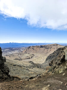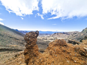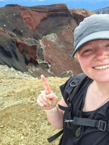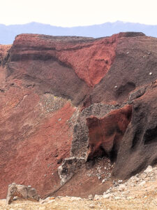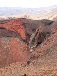 Mooi, die rode krater! En op allerlei plekken kom er stoom uit de grond. Er zat een helling naar beneden in waar je over puimsteen naar beneden moest glibberen (filmpje hieronder).