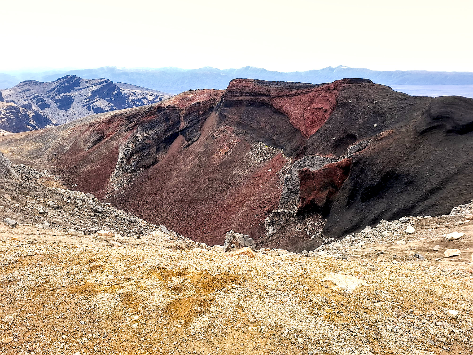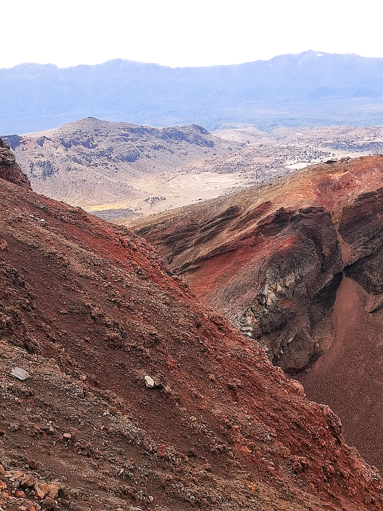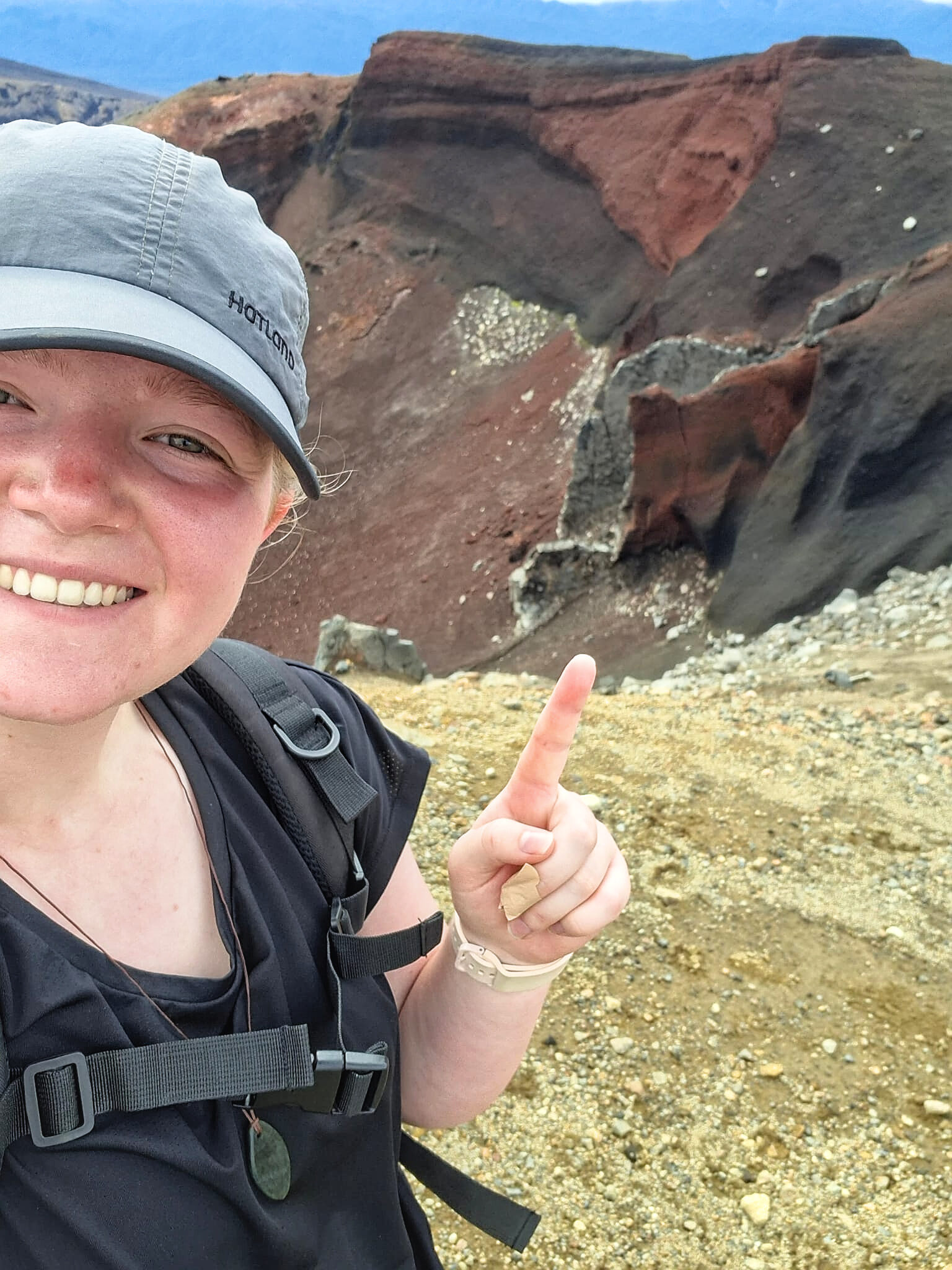 Mooi, die rode krater! En op allerlei plekken kom er stoom uit de grond. Er zat een helling naar beneden in waar je over puimsteen naar beneden moest glibberen (filmpje hieronder).