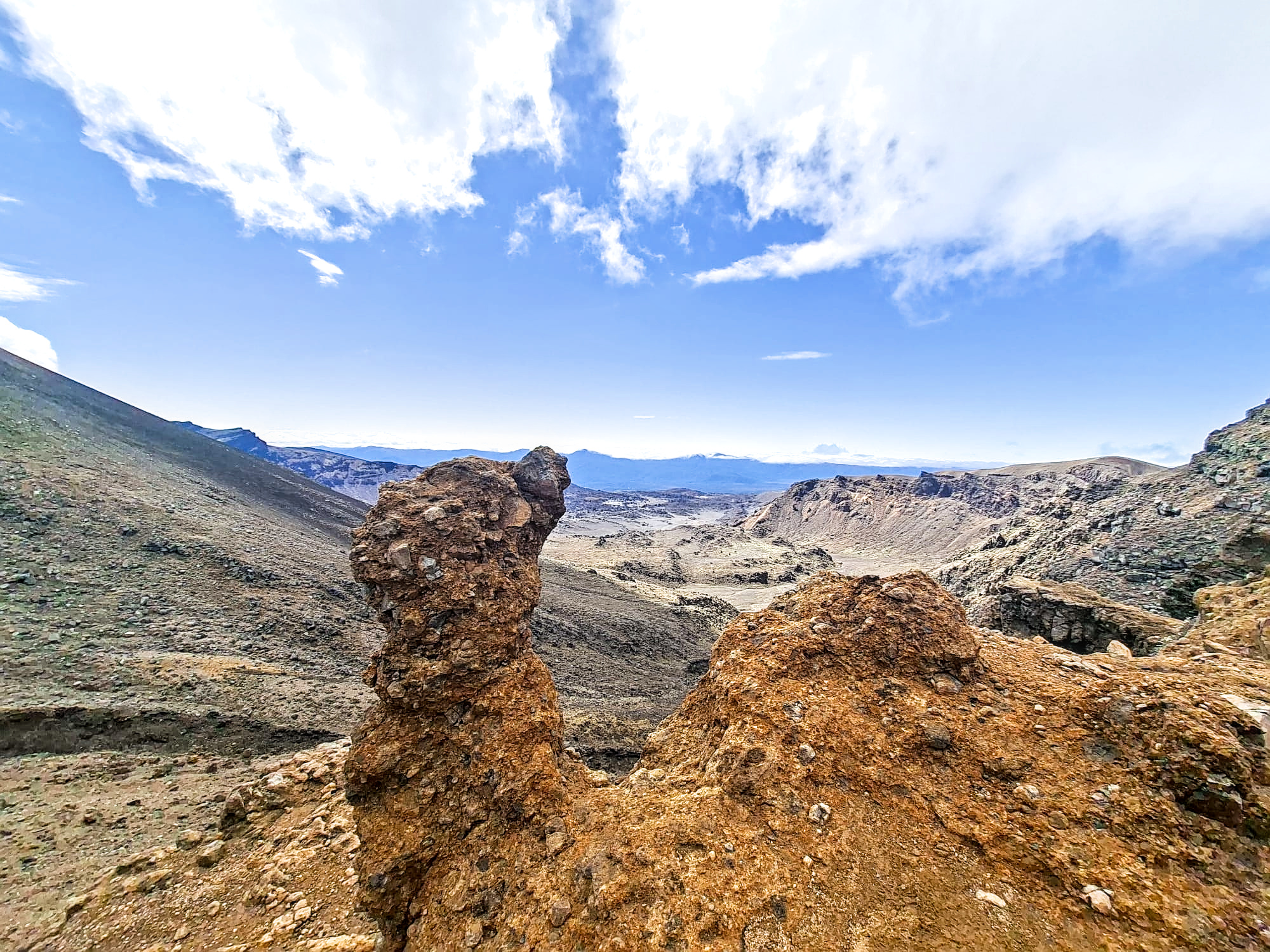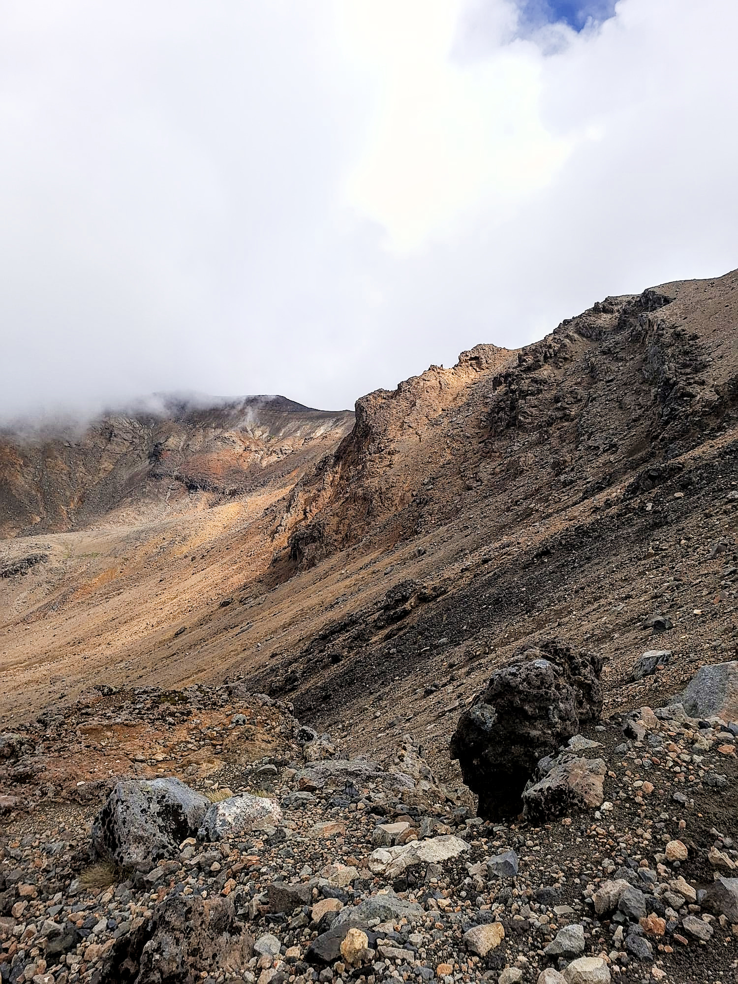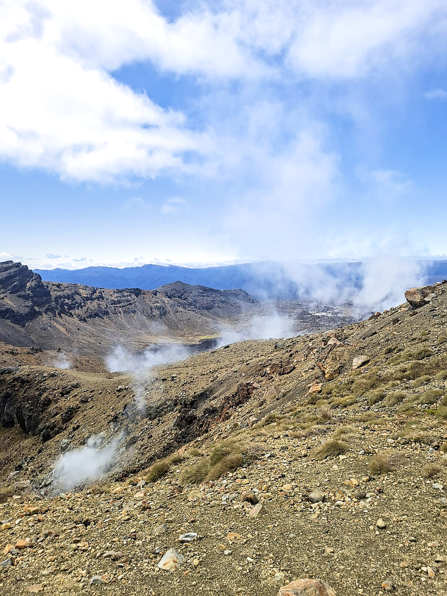 Mooi, die rode krater! En op allerlei plekken kom er stoom uit de grond. Er zat een helling naar beneden in waar je over puimsteen naar beneden moest glibberen (filmpje hieronder).