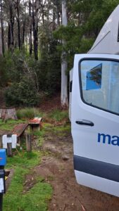 8-11 nov: Tasmanië: Vroeg opgestaan voor de vlucht. Eenmaal aangekomen gingen we meteen onze camper ophalen en reden we naar een mooi kustplekje. Het rammelde allemaal flink in die camper.