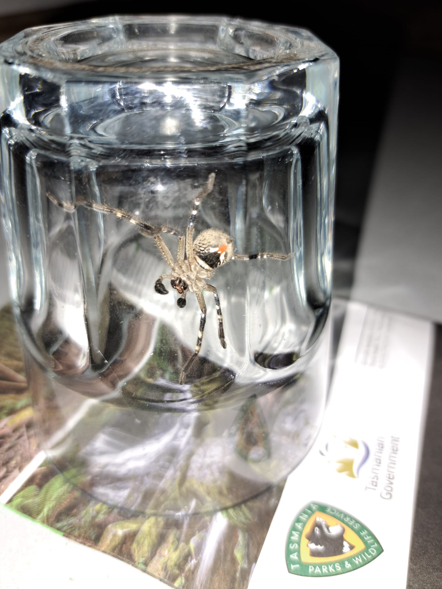Verder nog een wandeling gemaakt langs watervallen en eindelijk een wilde echidna (egelachtige) gezien en een hoop wallabies! ’s Avonds vlak voor het slapen was er een leuke verrassing op het raamgordijn. Een best flinke spin had zich daar mooi verstopt met zijn schutkleur. Spin gevangen en naar buiten gebracht waar Cynthia en ik er nog even naar keken, best cool beestje. Opgezocht wat het was en ze zeiden dat die spin zich vaak verschuilt in een bos (check), kruipt in campers (check), verstopt zich in gordijnen (check).